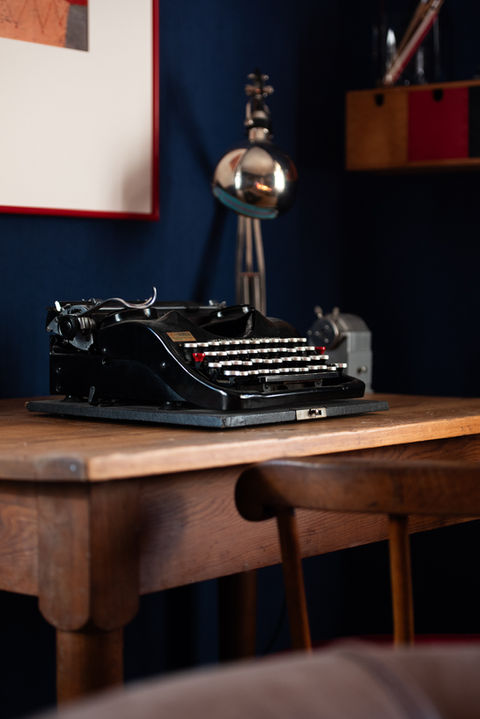 Im Wohnzimmer schaffen alte Möbel und elegante Ledersofas eine gemütliche Atmosphäre. Die blauen Wände verleihen dem Raum eine beruhigende Tiefe und setzen stilvolle Akzente. An den Wänden hängen sorgfältig ausgewählte Bauhaus-Bilder, die dem Ganzen einen Hauch von Kunst und Kultur einbringen. Diese harmonische Kombination aus klassischen Elementen und kräftigen Farben lädt zum Verweilen und Entspannen ein.